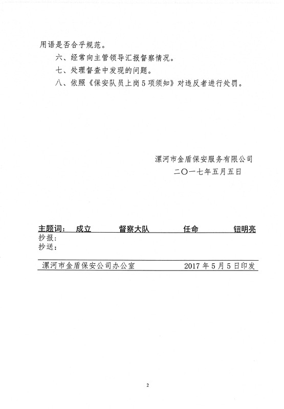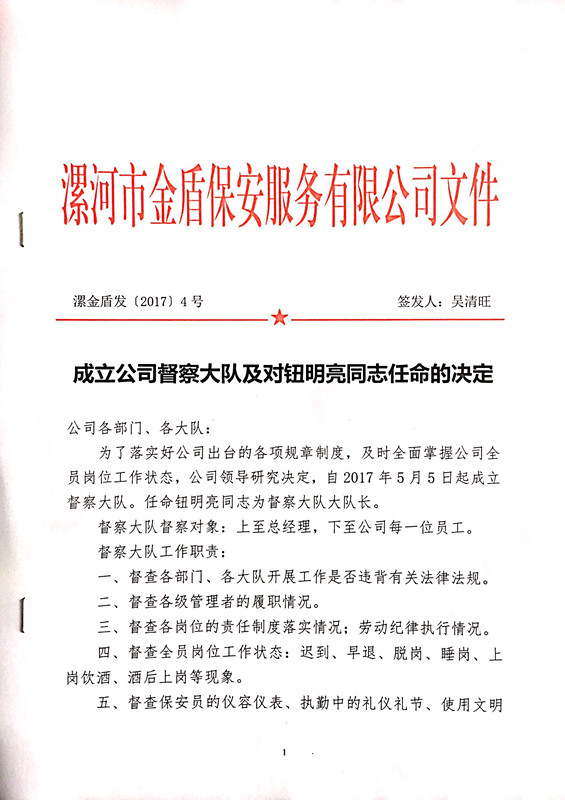 公司成立督查大隊(duì)及對(duì)鈕明亮同志任命的決定