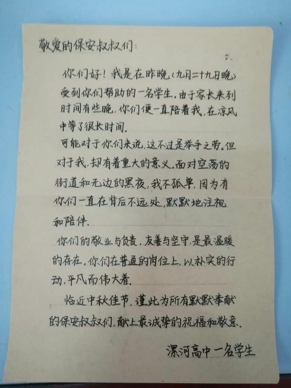 一封來(lái)自高中生寫(xiě)給漯河金盾保安大叔的感謝信