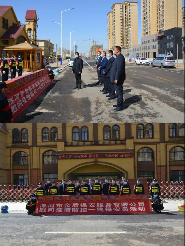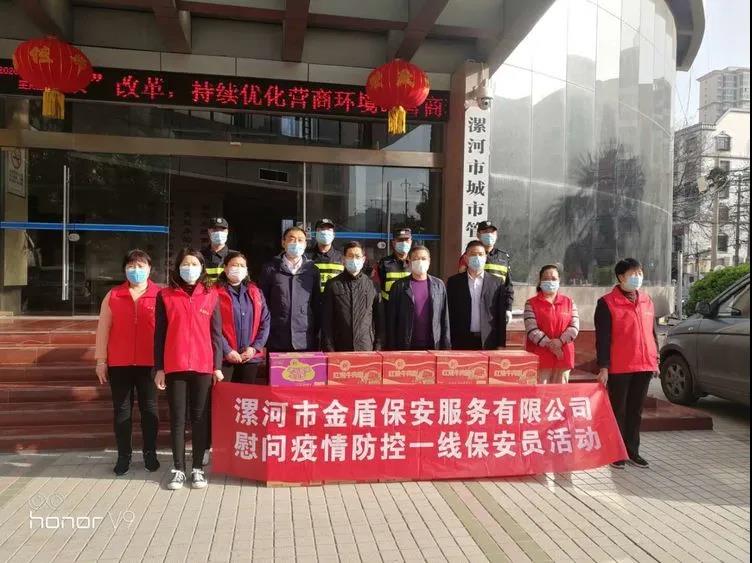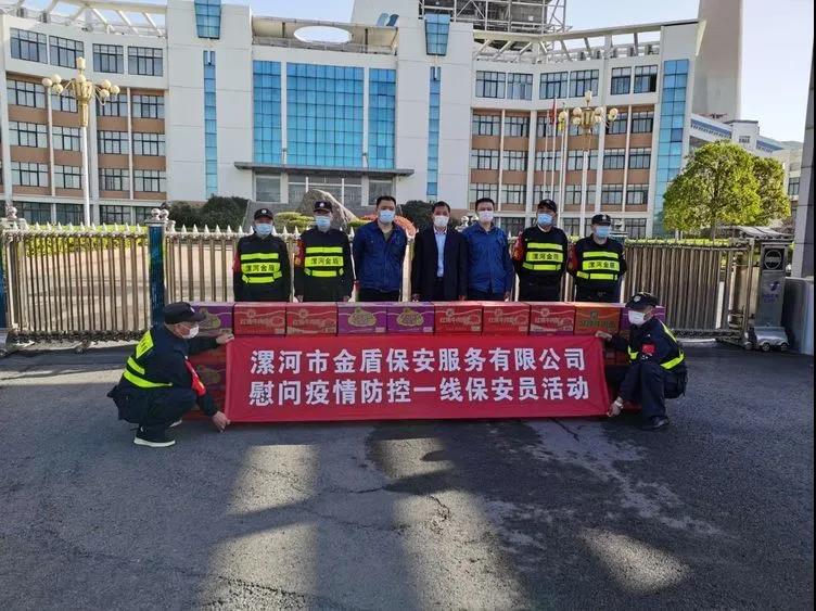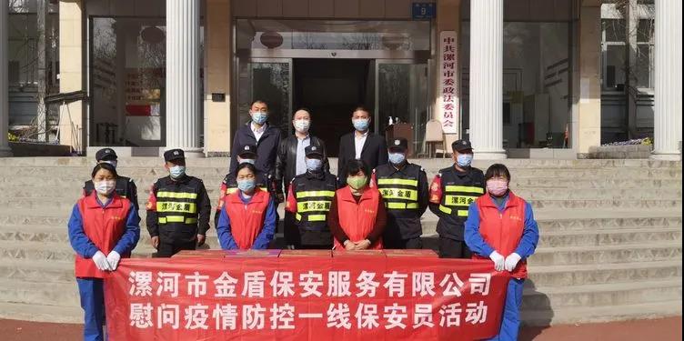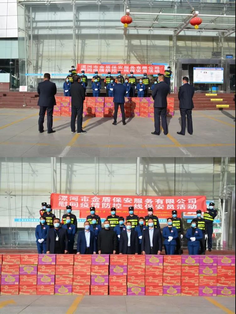 ▼源匯區(qū)機關(guān)事務(wù)服務(wù)中心綜合科科長張娜與公司領(lǐng)導(dǎo)班子共同慰問堅守在疫情防控一線的保安員代表。