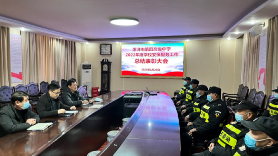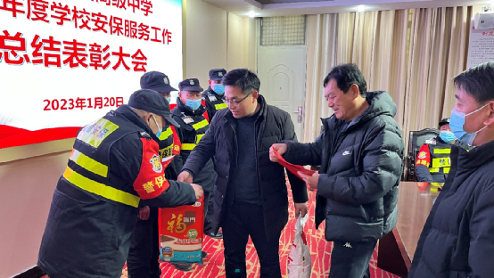 為激勵(lì)安保人員的士氣和工作熱情,進(jìn)一步加強(qiáng)學(xué)校安保服務(wù)工作,1月20日下午,漯河四高2022年度安保服務(wù)工作總結(jié)暨表彰大會(huì)在西校區(qū)小會(huì)議室召開(kāi)。會(huì)議總結(jié)了一年來(lái)學(xué)校安保服務(wù)工作開(kāi)展情況,表彰了在學(xué)校安保服務(wù)工作中做出積極貢獻(xiàn)的先進(jìn)個(gè)人。學(xué)校政教處主任芮光、政教處副主任王磊、漯河市金盾保安服務(wù)有限公司大隊(duì)長(zhǎng)史紅雷及全體保安隊(duì)員參加了此次大會(huì),大會(huì)由政教處副主任王磊主持。